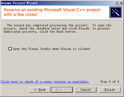 After processing is complete, the last wizard step is displayed. To open the new or updated project immediately, check the checkbox and click Finish. The project will be opened in the Visual C++ IDE, where it can be built, modified, and debugged as needed.